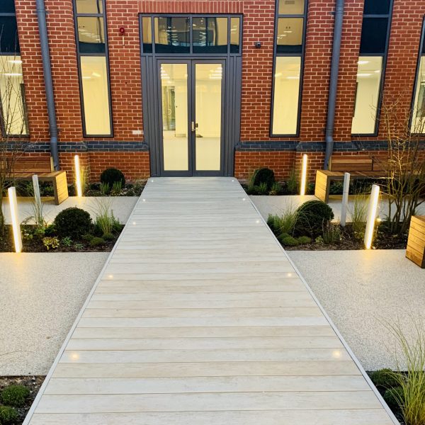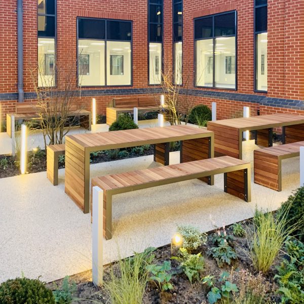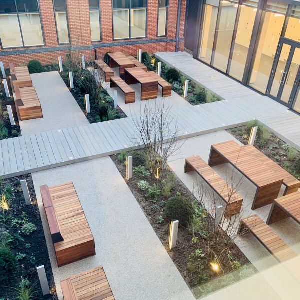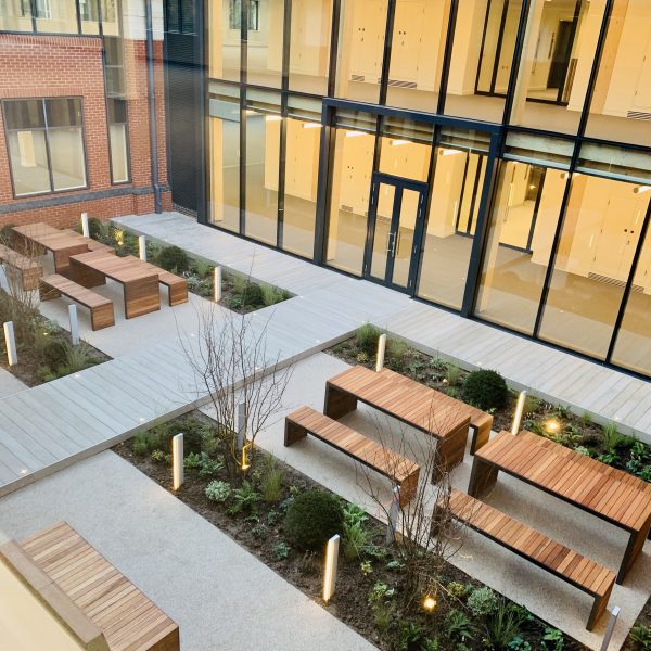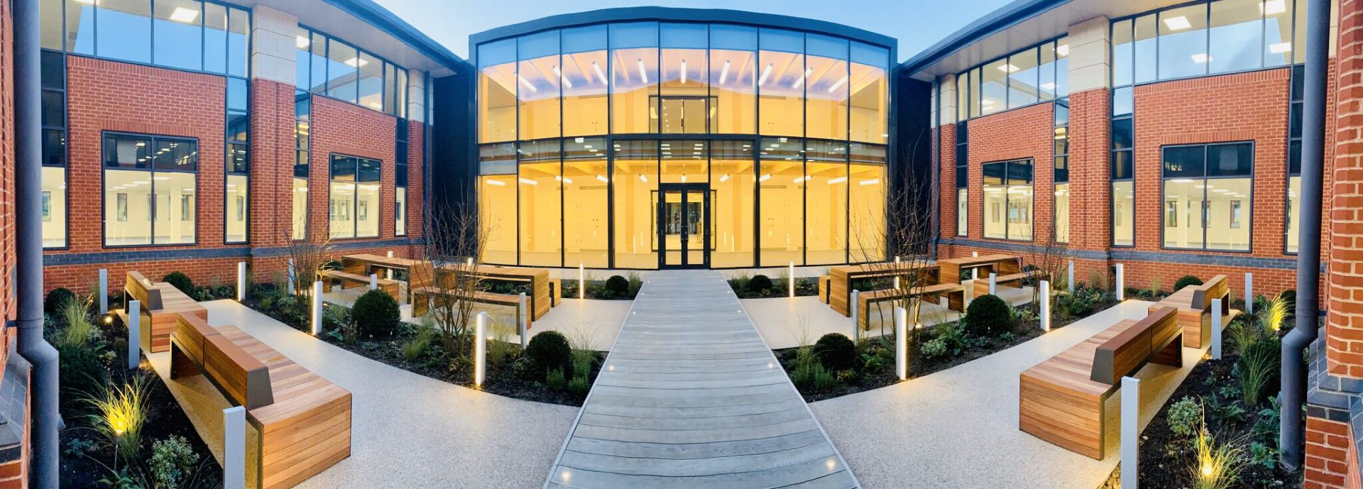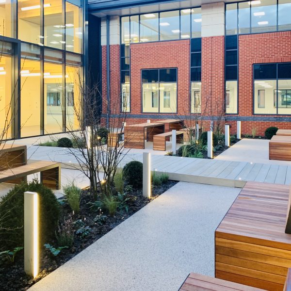 Cat A fit-out of an existing two-storey office space with a central infill extension of structural glazing, feature reception and landscaped courtyard.